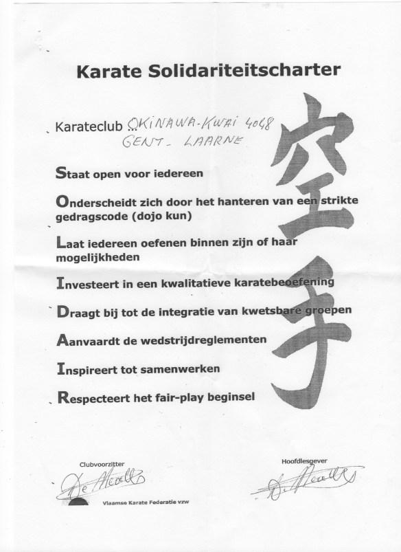 Om aan te geven dat onze club zich inzet om de waarden in onze sport en de solidariteit te versterken, heeft Okinawa Kwai mee het Solidariteitscharter ondertekend.